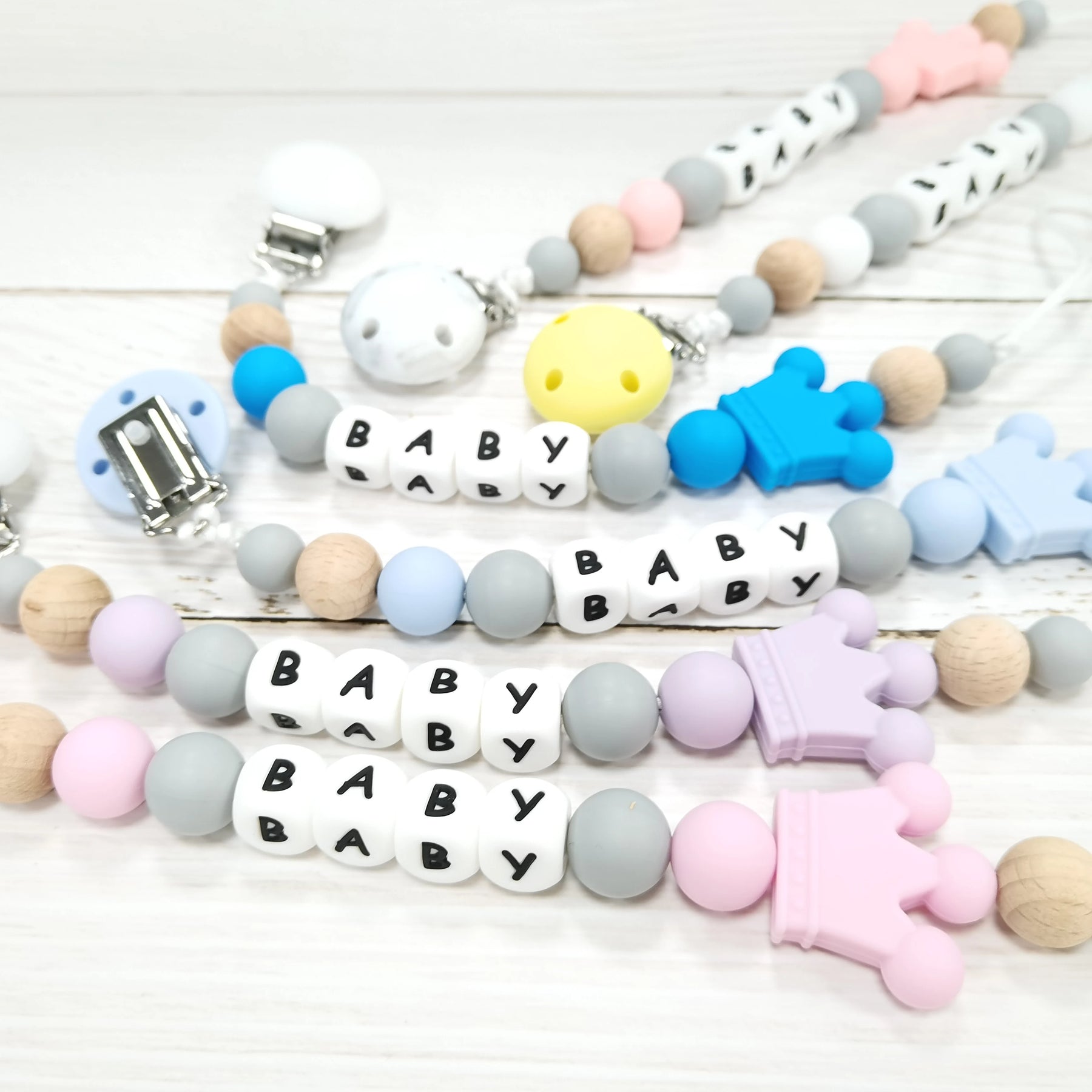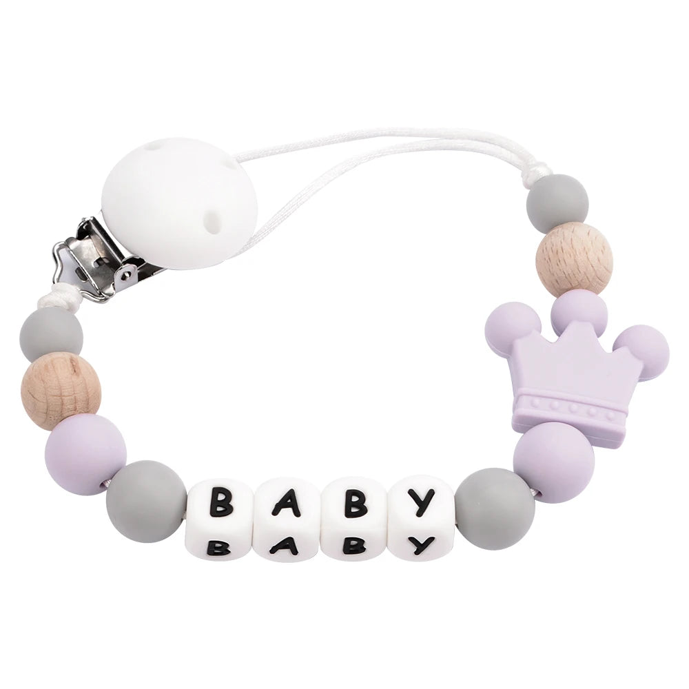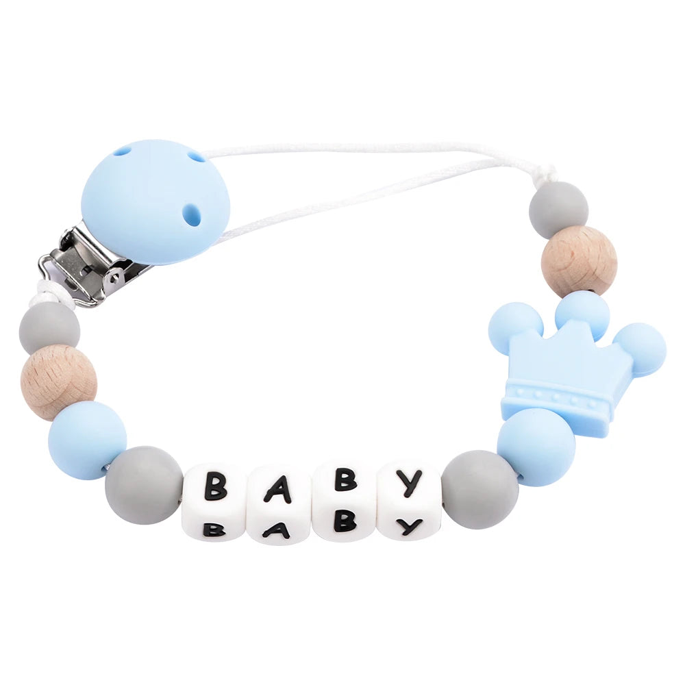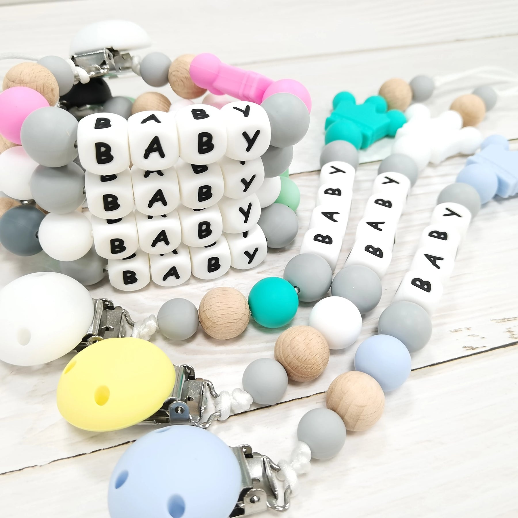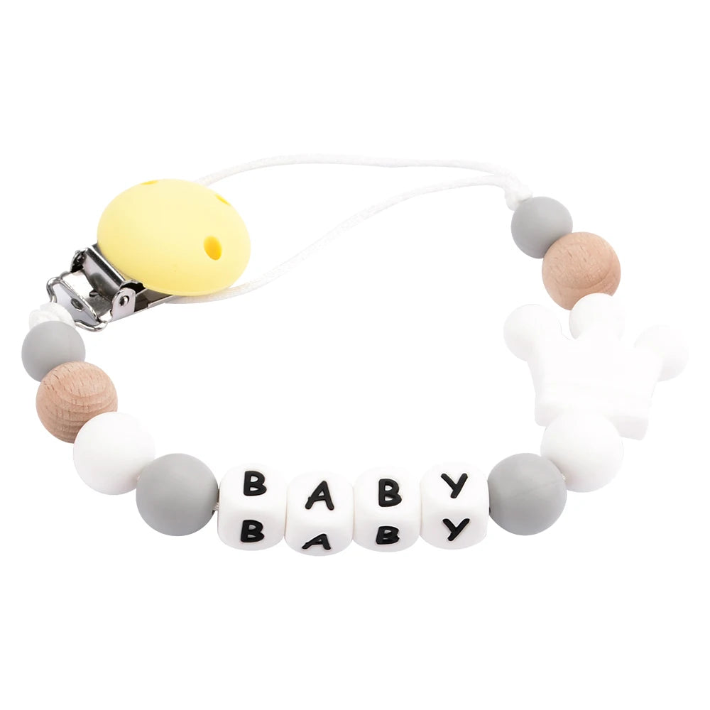 Dieser handgefertigte Schnullerclip aus BPA-freien Silikonperlen hält den Schnuller sicher und zugleich stilvoll. Der Name des Babys wird individuell integriert, sodass ein einzigartiges Accessoire entsteht, das sowohl praktisch als auch dekorativ ist. Perfekt für unterwegs, damit der Schnuller nicht mehr verloren geht, und ein wundervolles Geschenk zur Geburt oder Babyparty.