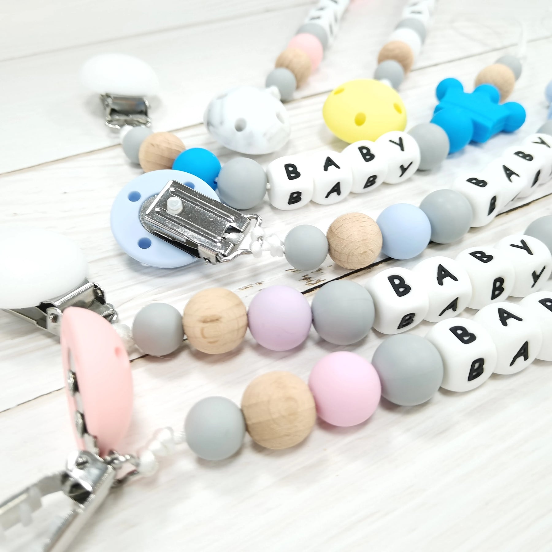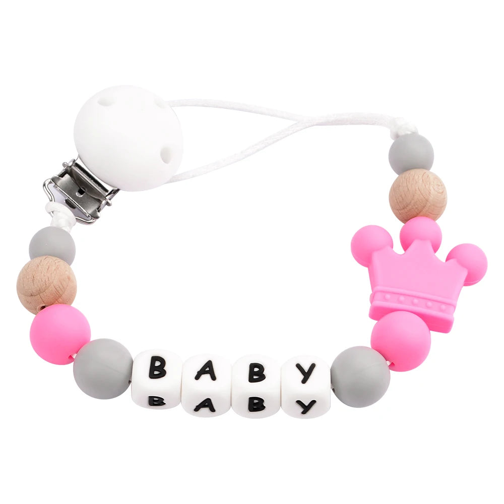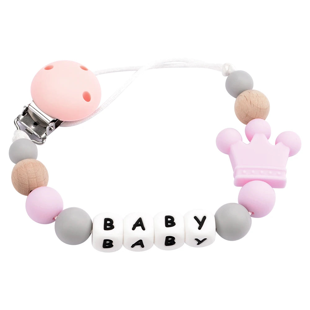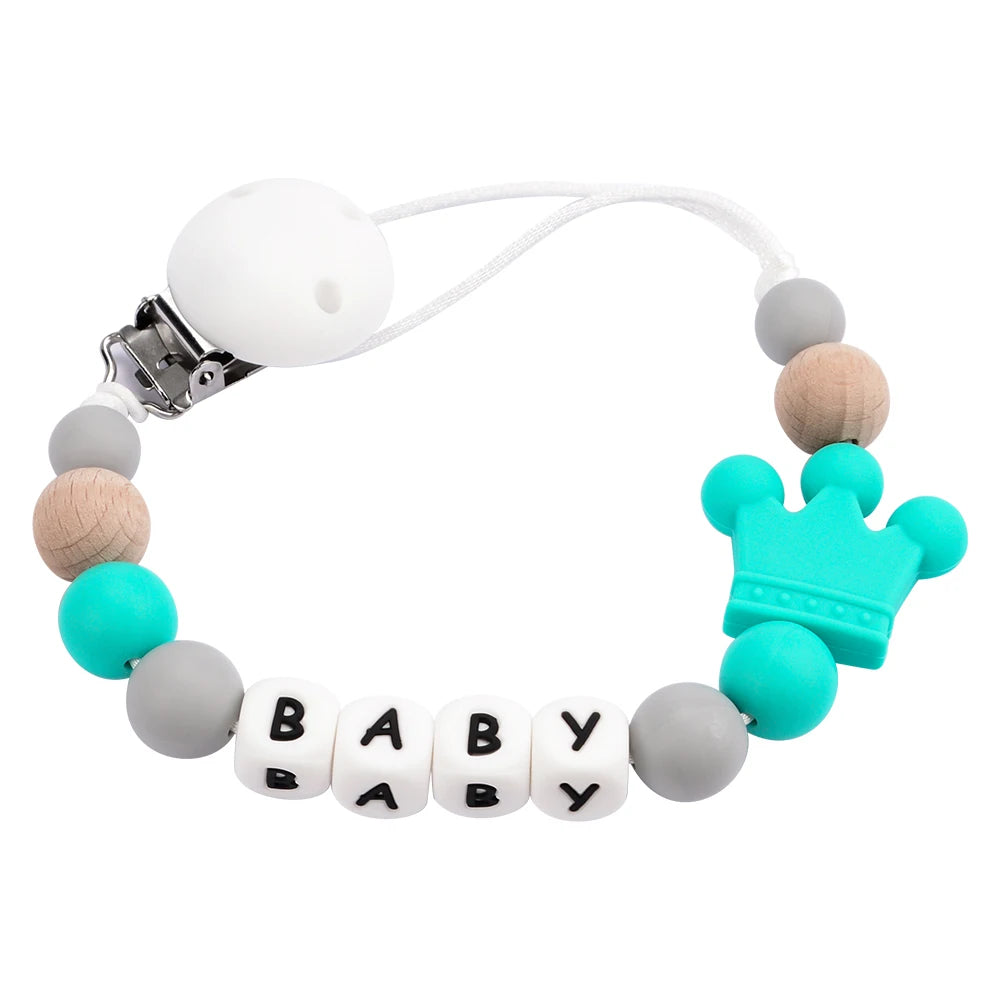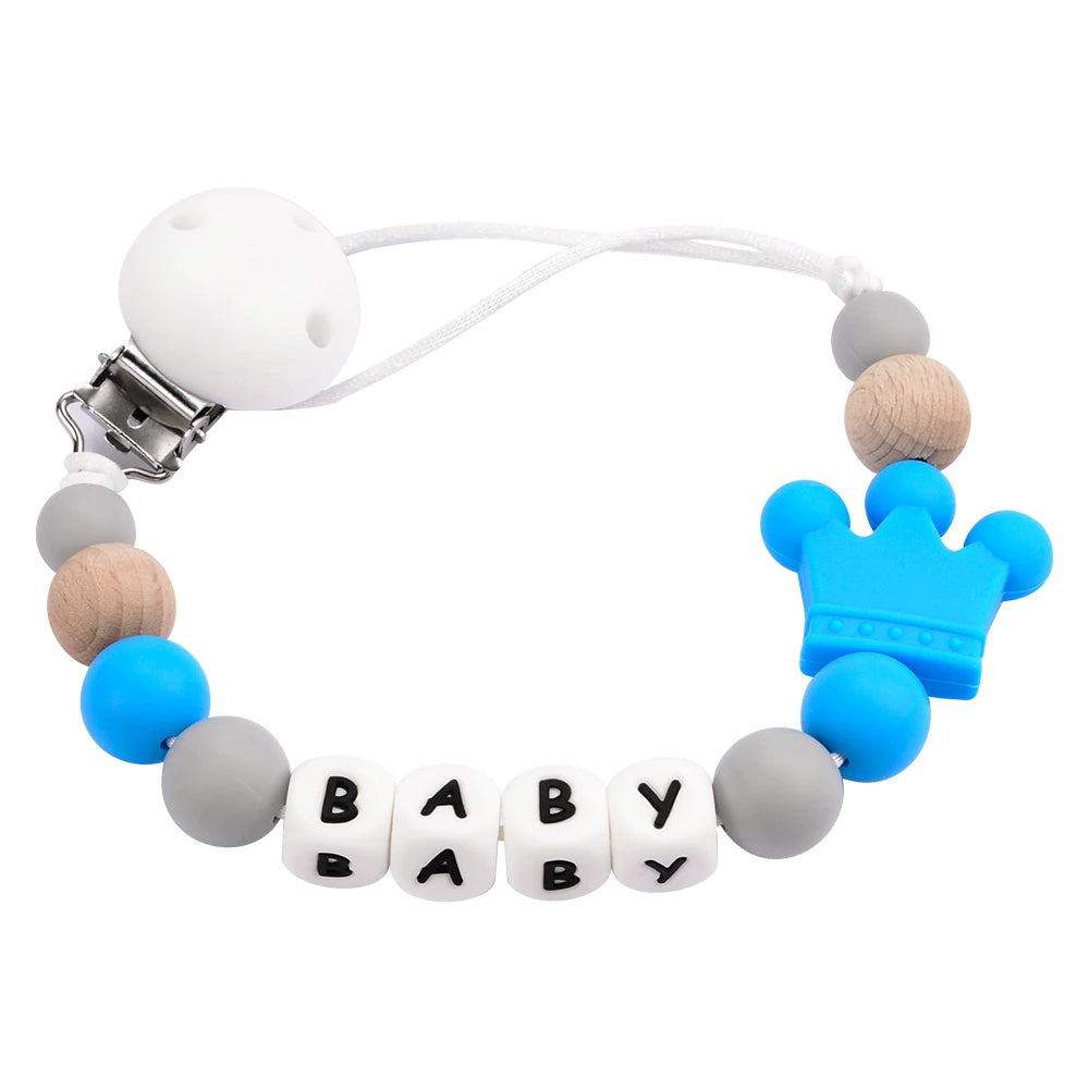 Dieser handgefertigte Schnullerclip aus BPA-freien Silikonperlen hält den Schnuller sicher und zugleich stilvoll. Der Name des Babys wird individuell integriert, sodass ein einzigartiges Accessoire entsteht, das sowohl praktisch als auch dekorativ ist. Perfekt für unterwegs, damit der Schnuller nicht mehr verloren geht, und ein wundervolles Geschenk zur Geburt oder Babyparty.