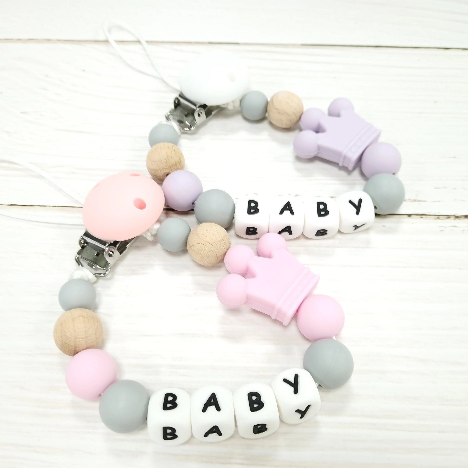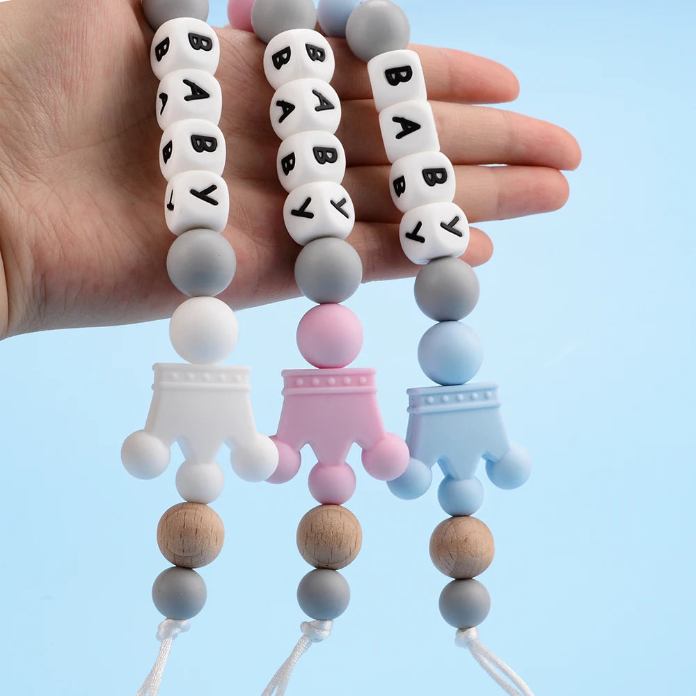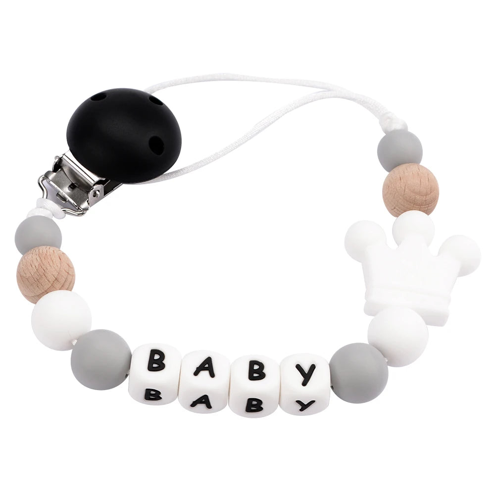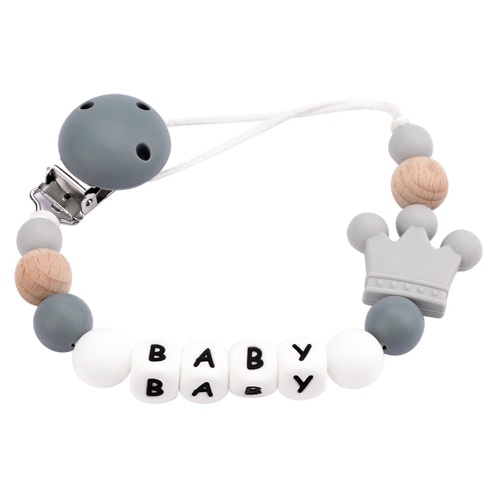 Dieser handgefertigte Schnullerclip aus BPA-freien Silikonperlen hält den Schnuller sicher und zugleich stilvoll. Der Name des Babys wird individuell integriert, sodass ein einzigartiges Accessoire entsteht, das sowohl praktisch als auch dekorativ ist. Perfekt für unterwegs, damit der Schnuller nicht mehr verloren geht, und ein wundervolles Geschenk zur Geburt oder Babyparty.