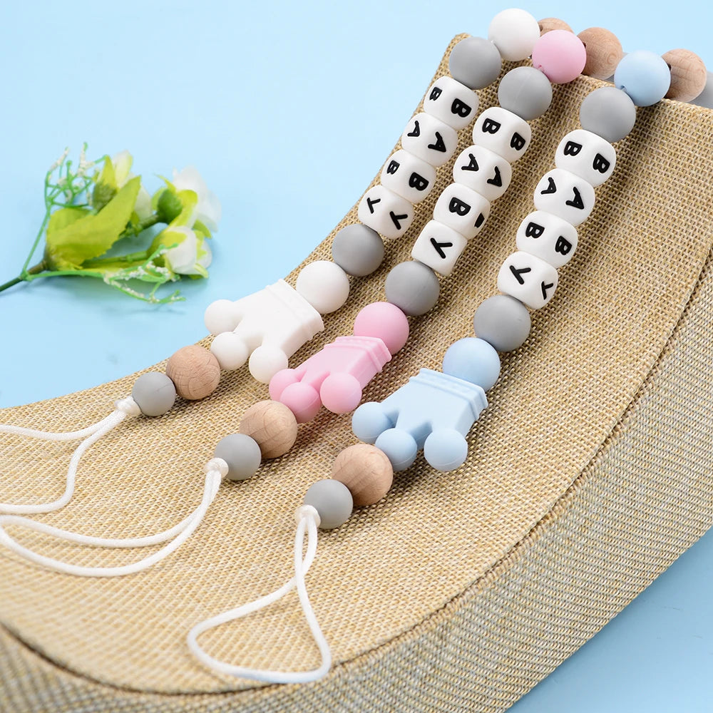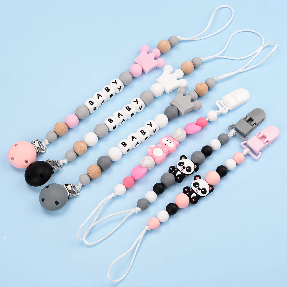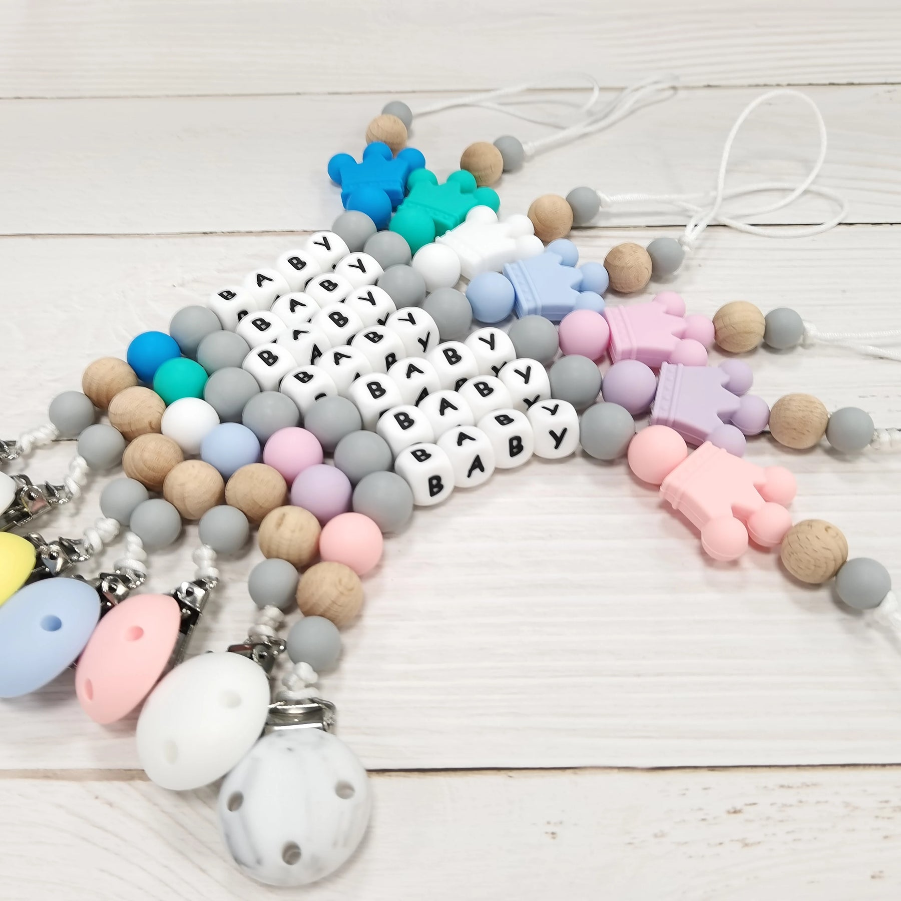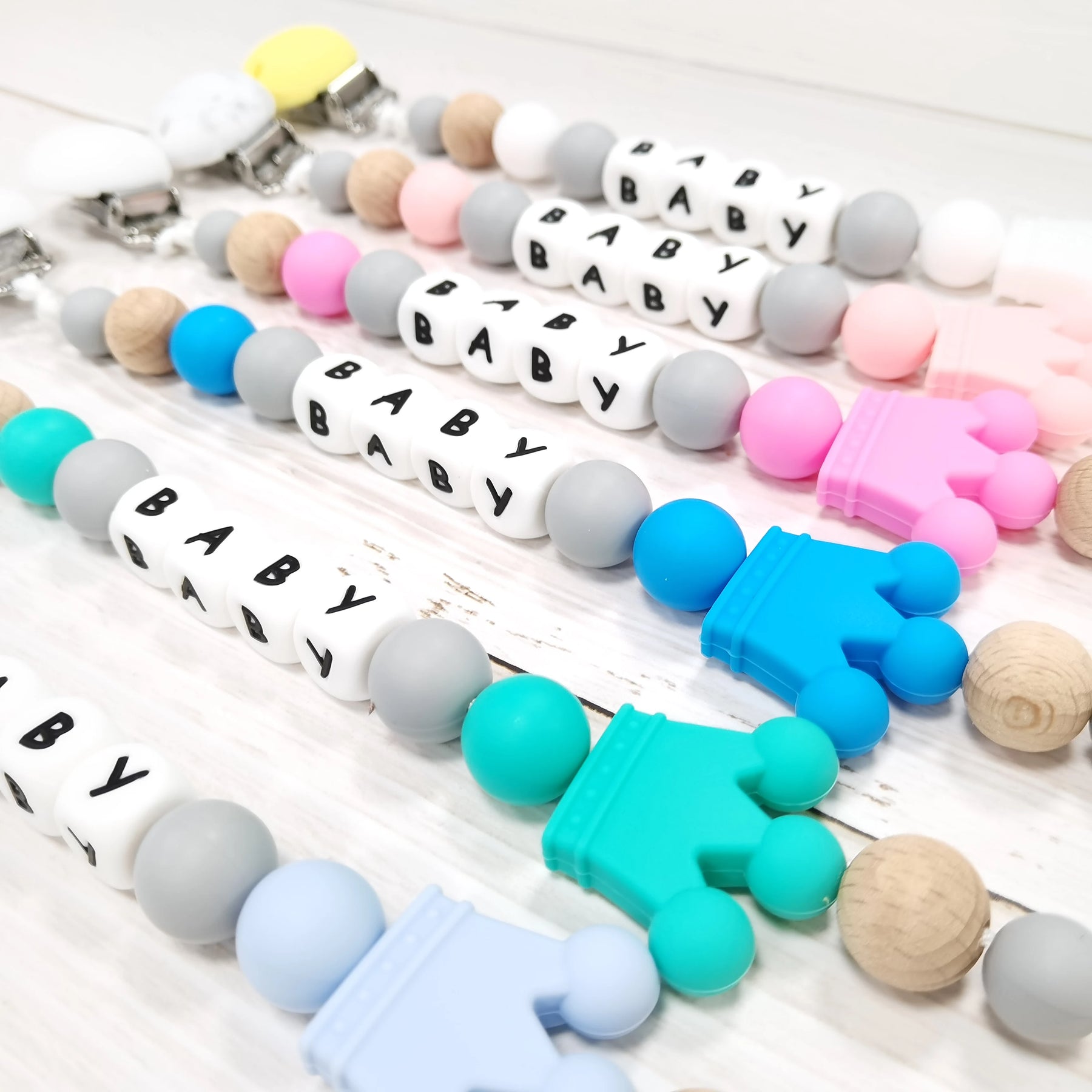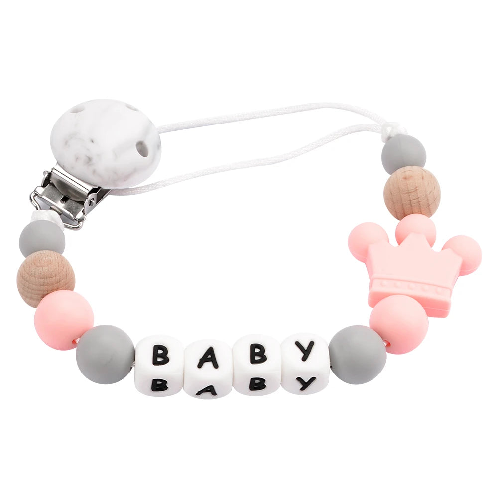 Dieser handgefertigte Schnullerclip aus BPA-freien Silikonperlen hält den Schnuller sicher und zugleich stilvoll. Der Name des Babys wird individuell integriert, sodass ein einzigartiges Accessoire entsteht, das sowohl praktisch als auch dekorativ ist. Perfekt für unterwegs, damit der Schnuller nicht mehr verloren geht, und ein wundervolles Geschenk zur Geburt oder Babyparty.